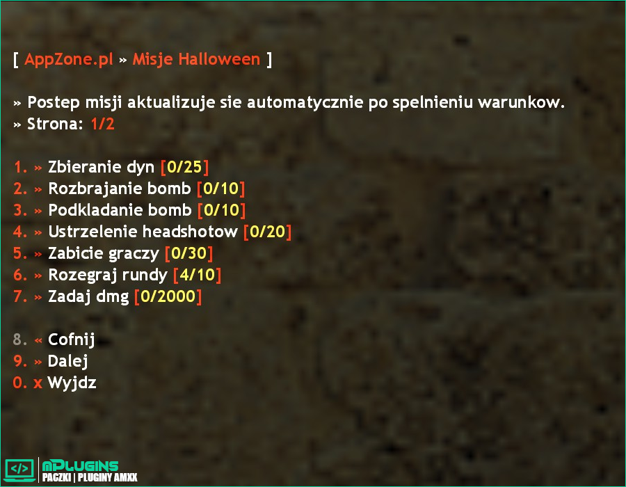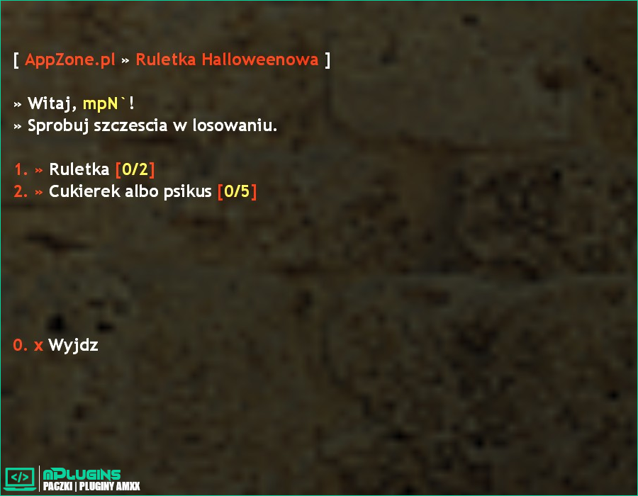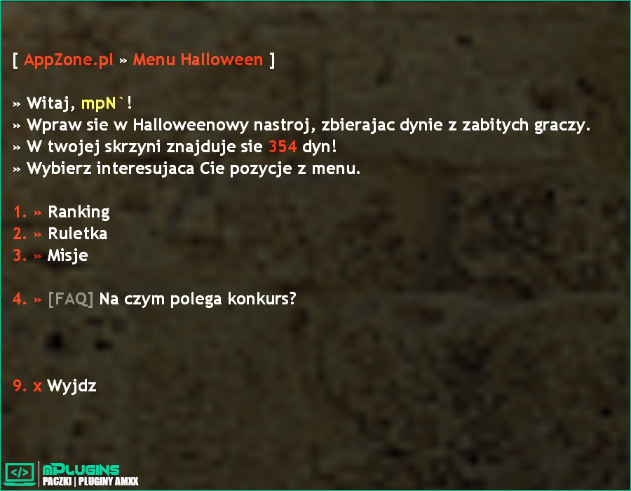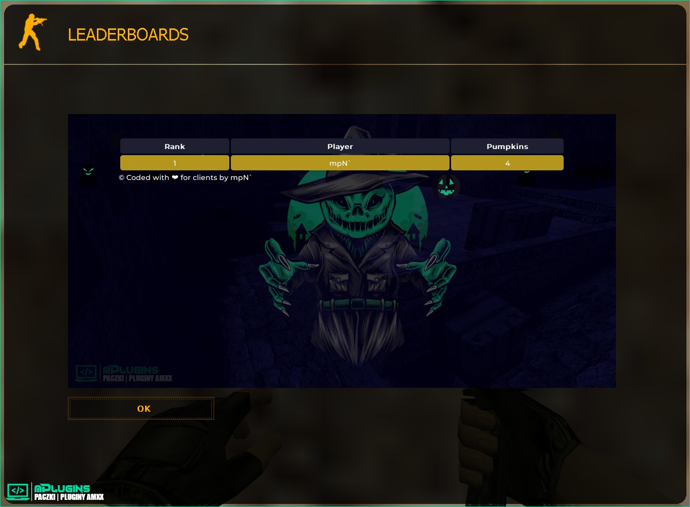 Event Halloweenowy polega na gromadzeniu dyń, które pojawiają się obok ciał martwych graczy. Oprócz zbierania dyń leżących na ziemi po zabójstwie, możesz również spróbować swojego szczęścia w ruletce. W ruletce masz szansę na wygraną lub stratę określonej liczby dyń, a nawet na utratę życia! Możesz skorzystać z niej 2 razy na mapę, pod warunkiem, że jesteś żywy, oraz z zabawy cukierek albo psiukus 5 razy na mapę. Plugin zawiera ranking, który pokazuje graczy z największą liczbą zebranych dyń.