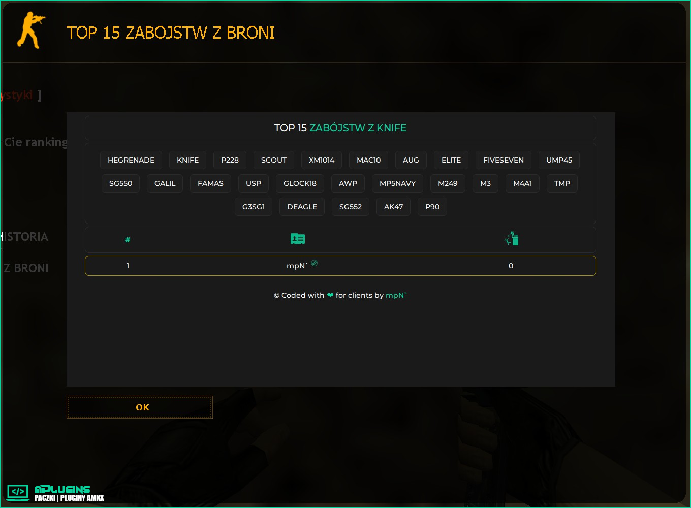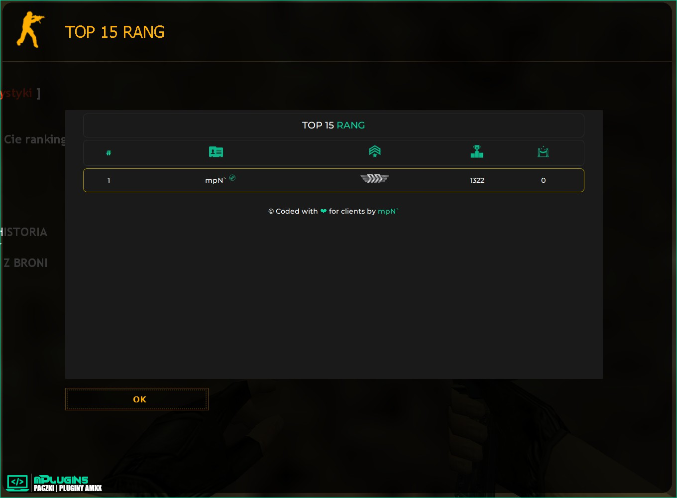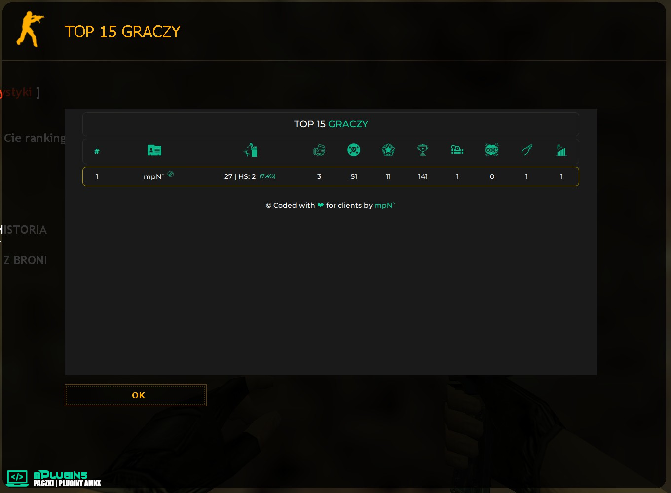 Plugin zastępuje standardowe statystyki Top15 oraz ranking.