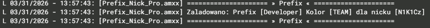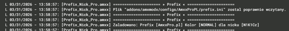 - Logowanie zdarzeń: Rozbudowany system logów w konsoli serwera informuje o poprawnym wczytaniu konfiguracji oraz przypisaniu prefixu konkretnemu graczowi podczas jego wejścia na serwer.